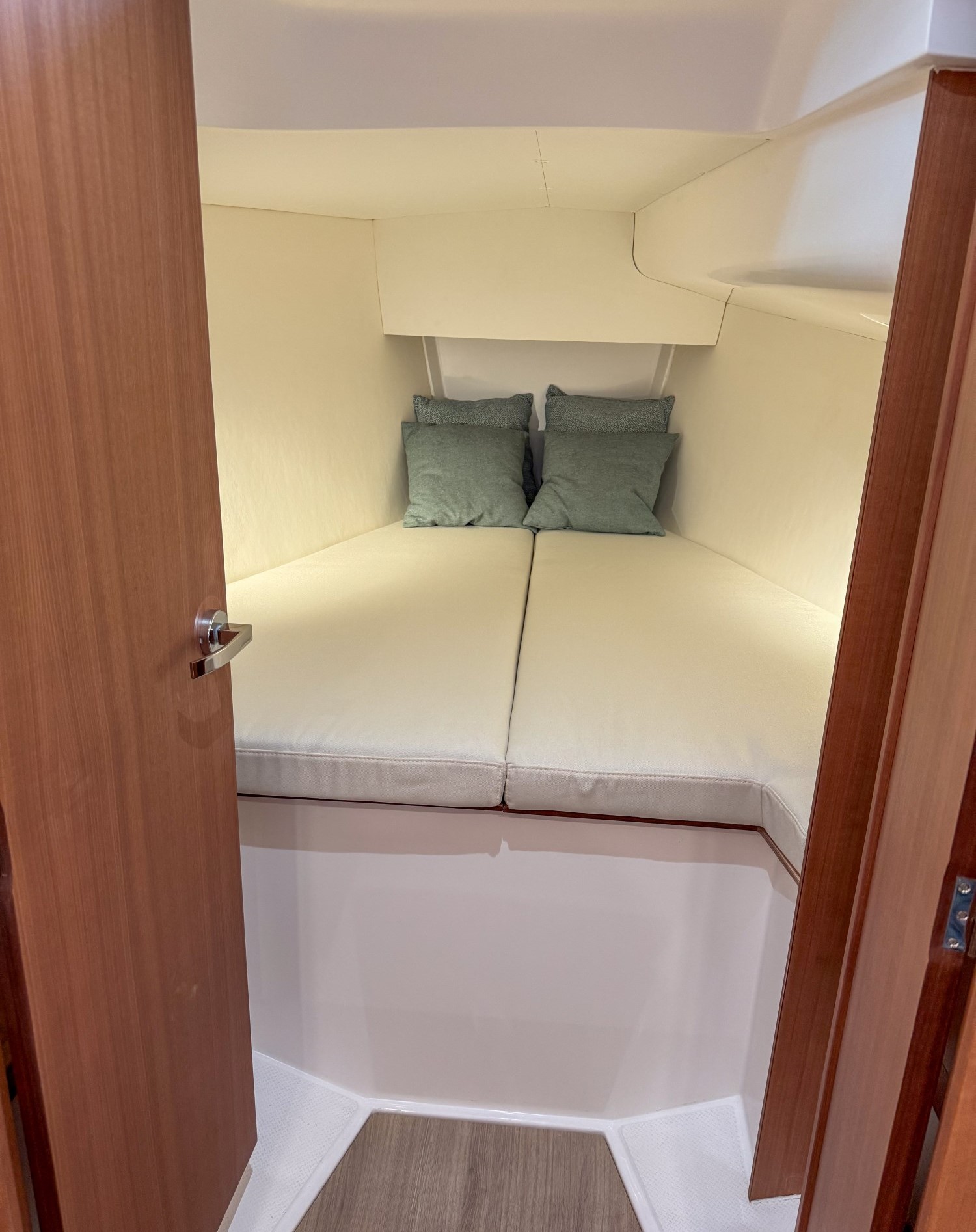 Below deck, the J/36 takes interior comfort to a new level with a spacious and bright two cabin/aft head layout to accommodate two couples or a family with children. The varnished mahogany joinerwork adds classic warm wood accents. The large cabin ports and bright surfaces provide abundant natural light and ventilation to enhance the sense of open space below.